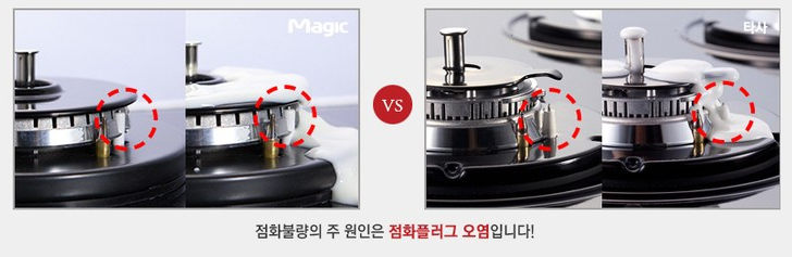 - 점화 레버를 돌리면 따다닥 점화 불꽃이 튀기며 정상적으로 점화되나 레버를 놓으면 불꺼짐 점화불량 현상