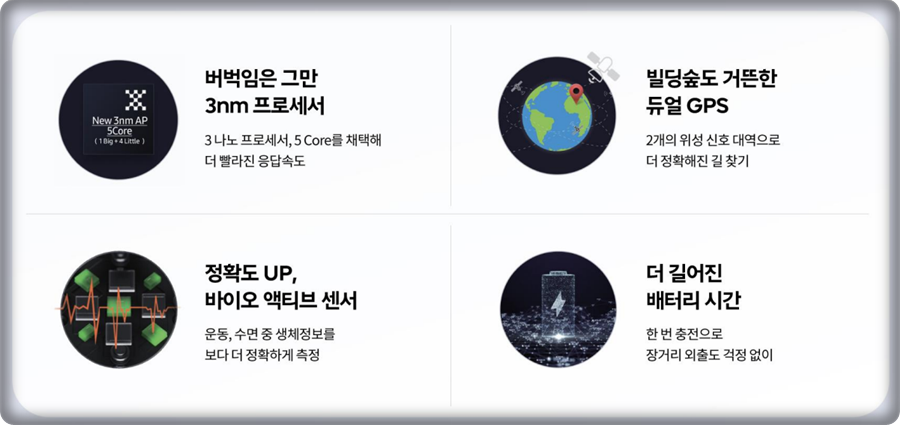 갤럭시 워치7의 새로운 3나노, 펜타 코어 프로세서와 함께 일상의 변화를 경험해 보세요. 빠른 애플리케이션 실행과 전환은 물론, 배터리 사용 시간까지 최적화되어 더 오랜 시간 사용할 수 있습니다.
