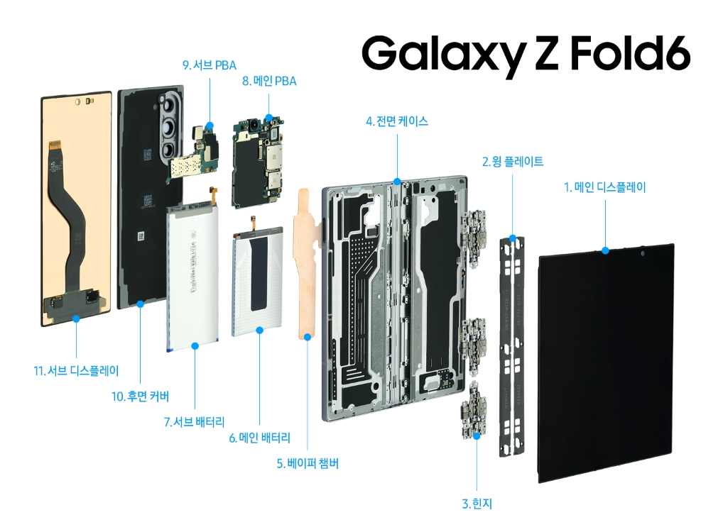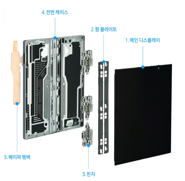 윙 플레이트는 갤럭시Z폴드6를 원활하게 펼치고 닫을 수 있게 도움을 주는 부품이다. 디스플레이와 힌지 사이에서 움직이며 내부를 정렬해 주고, 디스플레이를 기계적 손상으로부터 보호해 준다. 윙 플레이트에는 극한의 얇은 두께에도 강력한 힘을 발휘하는 특수 소재를 적용했다.