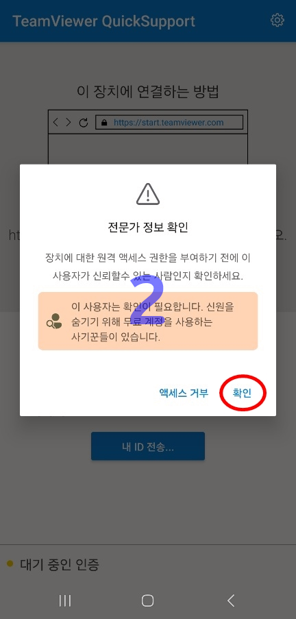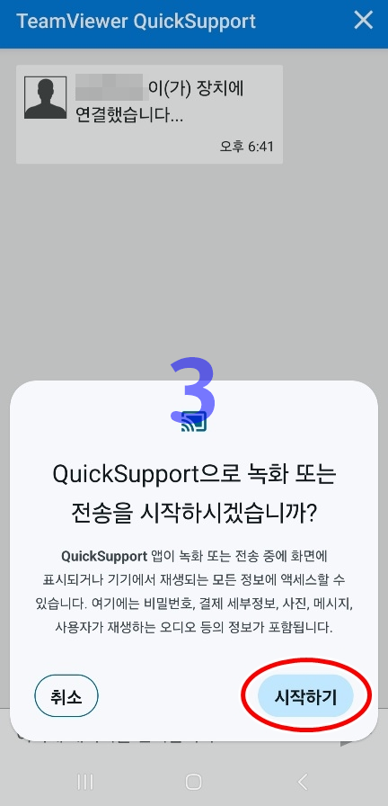 - 팀뷰어에서 "원격제어"를 클릭하면 제어할 스마트폰(부모님폰)에서 2.엑세스 권한을 확인 > 3.시작하기를 클릭하면 원격제어 가능합니다.