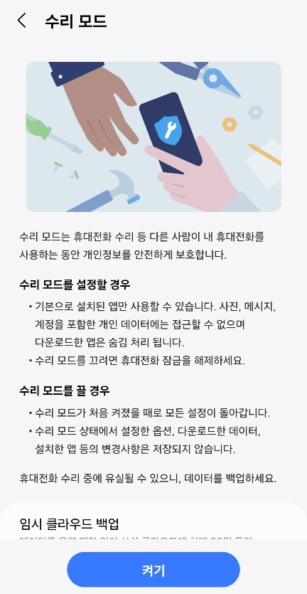 수리모드는 휴대전화 수리 등 다른사람이 내 휴대전화를 사용하는 동안 개인정보를 안전하게 보호 합니다.