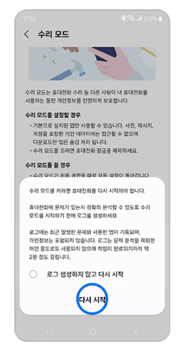 ✅ 6단계: 다시 시작을 선택하면 휴대폰이 다시 시작되고 수리모드가 활성화 됩니다.