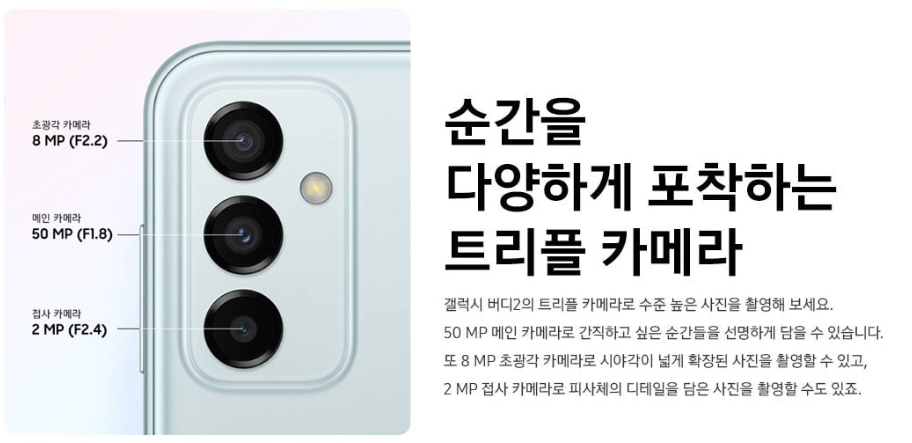 ✅ 후면카메라: 5000만화소 + 800만화소 + 200만화소