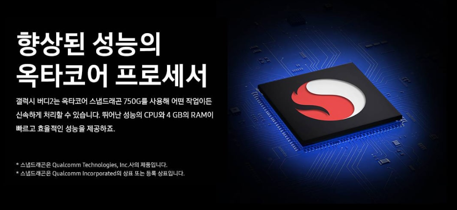 갤럭시 버디2는 중급형 스마트폰 시장에서 가격 대비 성능이 뛰어난 모델로, 넓은 화면, 다양한 카메라 옵션, 대용량 배터리 등 실용적인 기능을 갖추고 있습니다. 스냅드래곤 750G 칩셋을 기반으로 안정적인 성능을 제공하며, 5000mAh 배터리는 장시간 사용할 수 있는 강력한 내구성을 자랑합니다.