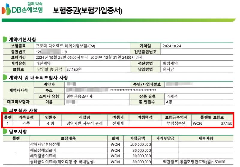 DB다이렉트 해외여행보험 4명 고급형 6일 - 37,150원