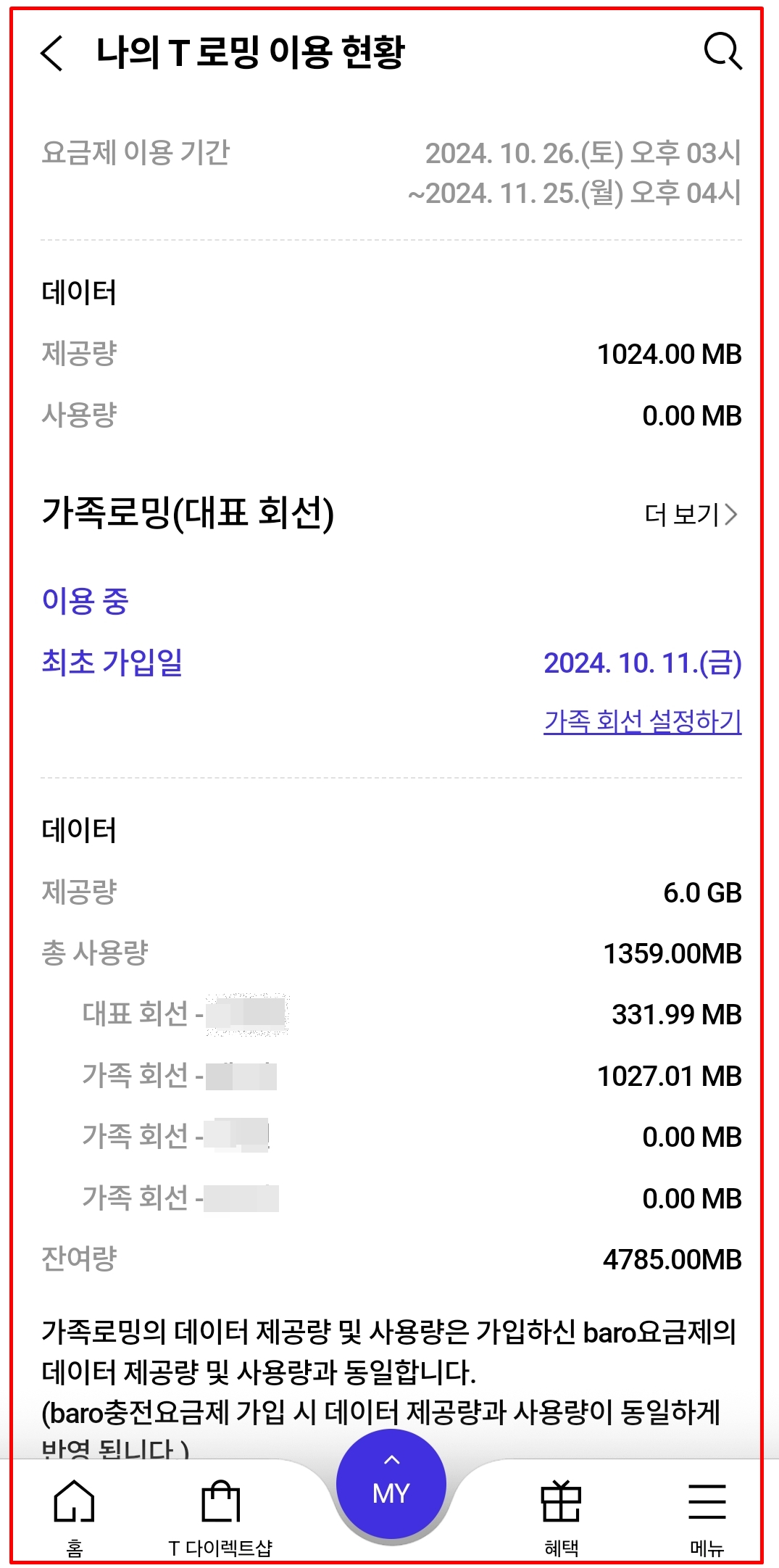 - 가족모두 SK텔레콤 사용으로 baro요금제 6GB 39,000원 (최대 30일) 신청