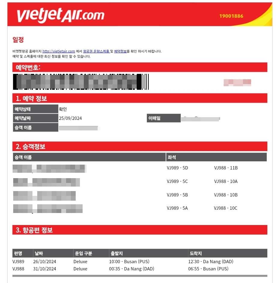 ■ 부산(PUS) ↔ 다낭(DAD) 비엣젯 VJ989 2024년 10월 26일 10:00