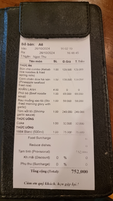 대표 인기 메뉴 5가지를 시켜 생맥주 가지 마셨는데 752,000VND (37,600원) 정도 나왔네요.
