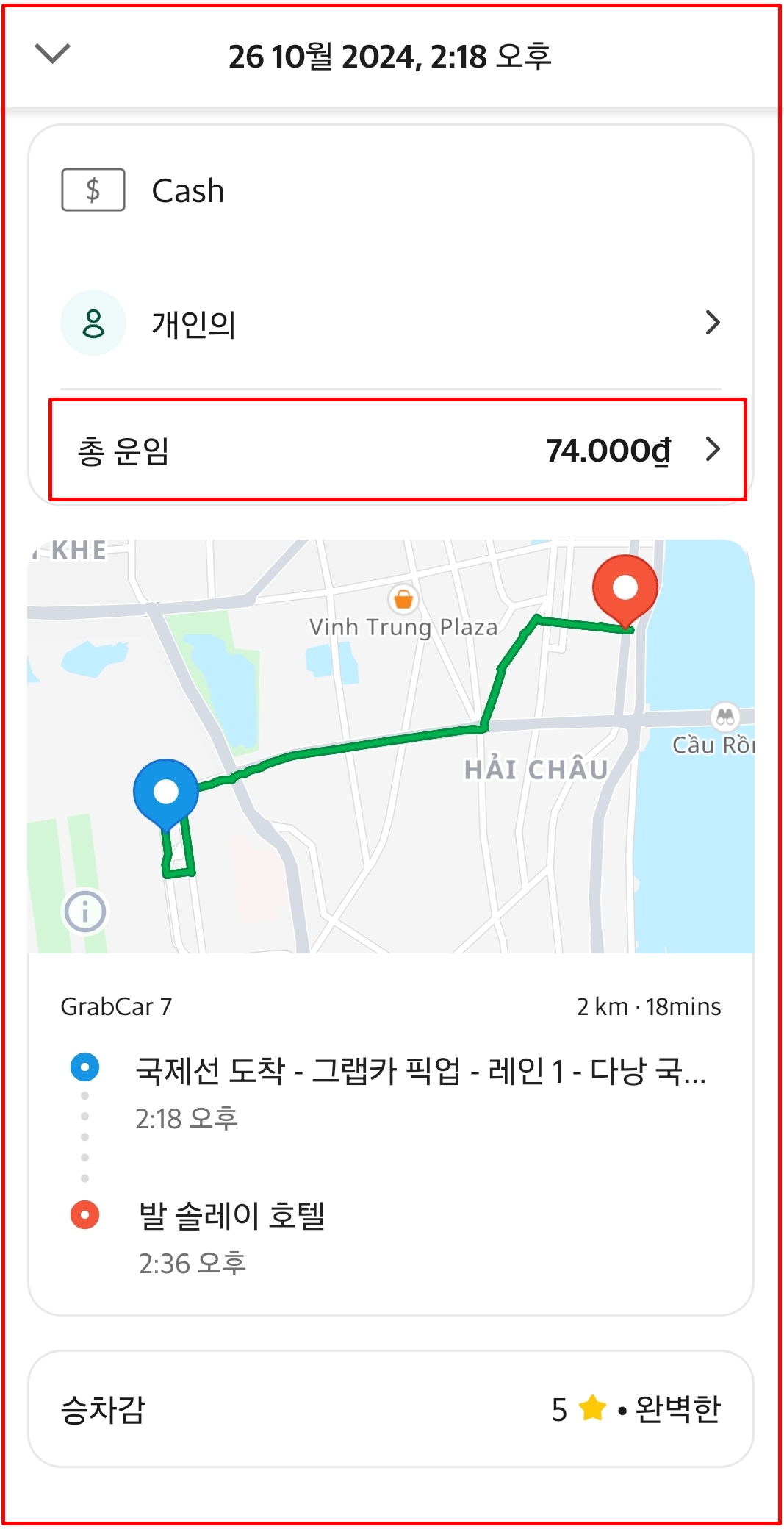 다낭공항에서 시내까지는 10분 ~ 15분정도 소요 됩니다. 공항횡단보도 건너편에 Grab존이 있습니다. 그랩을 호출하나 바로 잡히네요. Grab Car7 거리는 2Km 비용은 74,000VND (3,700원 정도) 입니다.