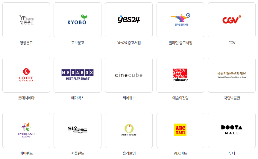전국 서점과 영화관 등 2만여 사용처와 게임, 쇼핑 등 다양한 온라인 사이트에서 사용하실 수 있습니다.