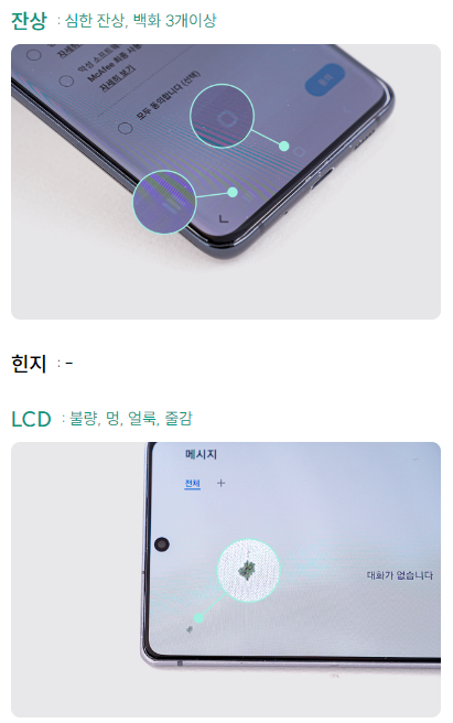 B등급: 기능 문제없고 외관 흠집, 액정 흠집/잔상이 있는 상태 (생활기스, 잔기스 등)