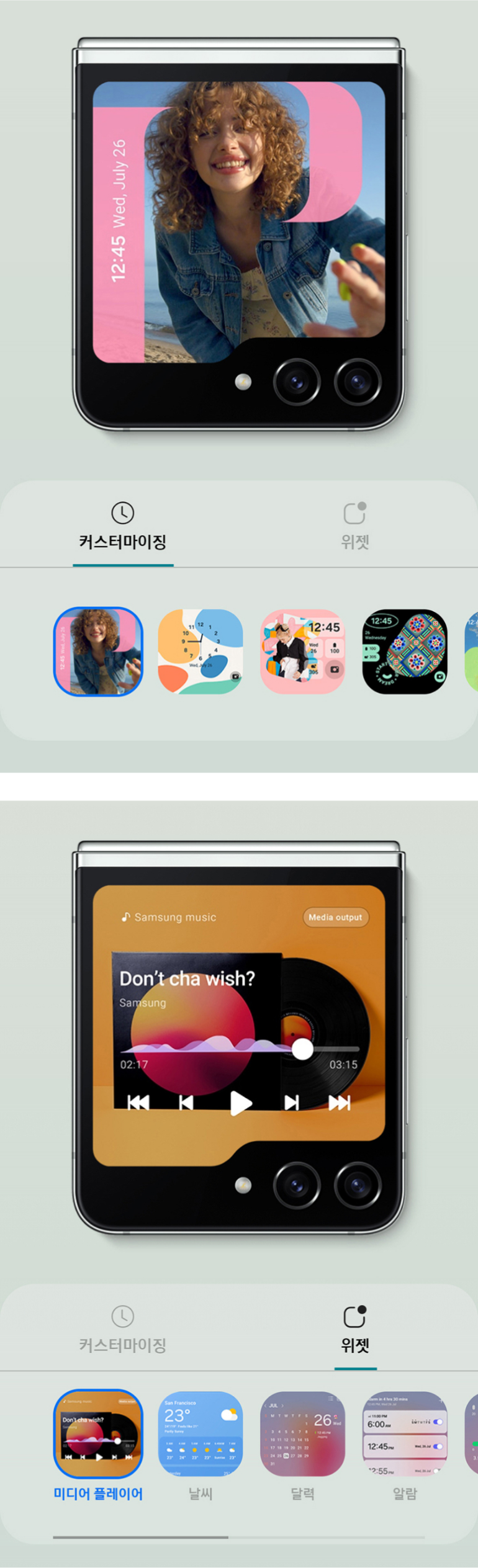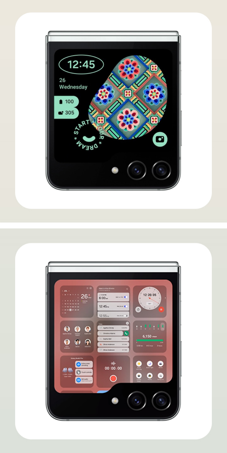 다양한 위젯, 비디오 월페이퍼, 시계 화면, 스타일 등으로 커스터마이징하여 오직 나만의 갤럭시 Z 플립5로 만들어 보세요.