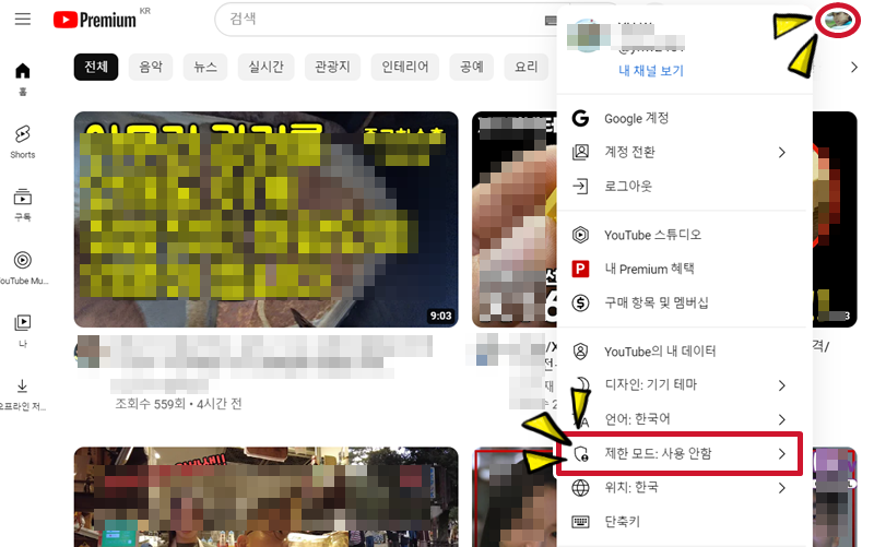 pc의 경우 오른쪽 상단에 프로필을 선택하면 "제한모드" 활성화를 옵션을 눌러서 설정 가능합니다.