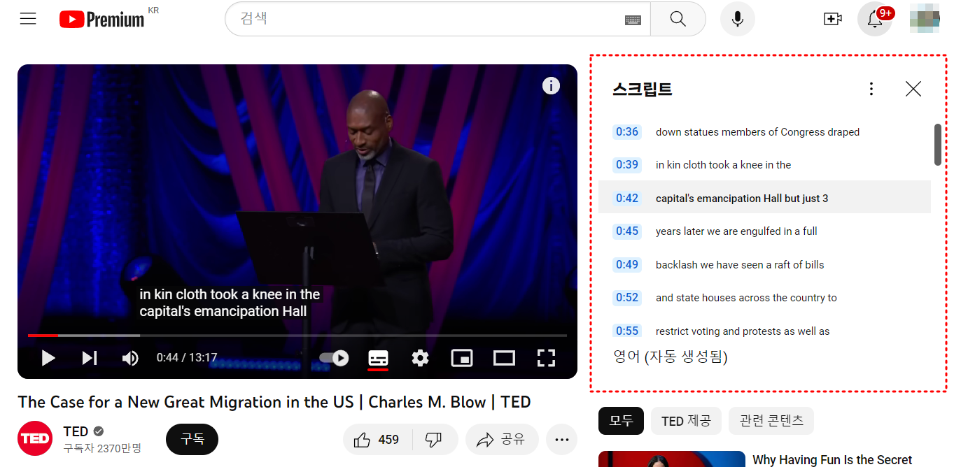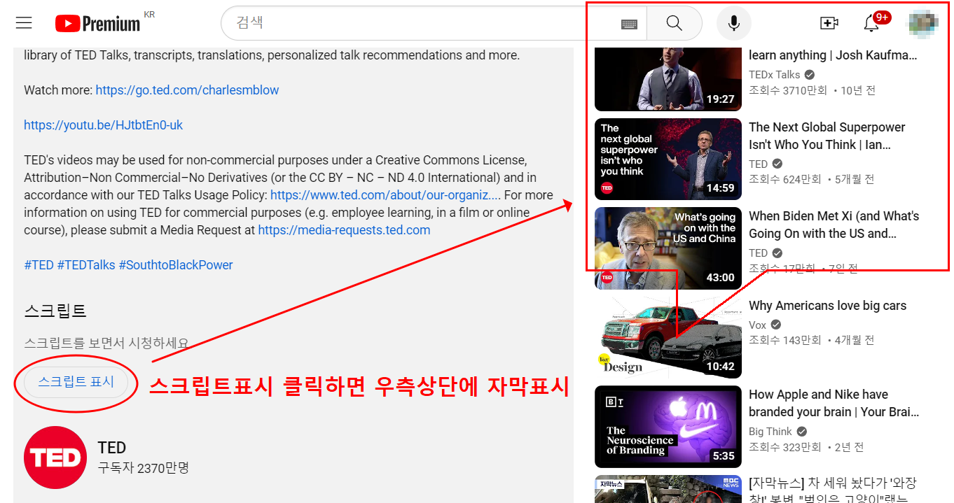 유튜브 더보기 클릭후 스크립트를 활성하면 우측상단에 스크립트가 표시 됩니다.