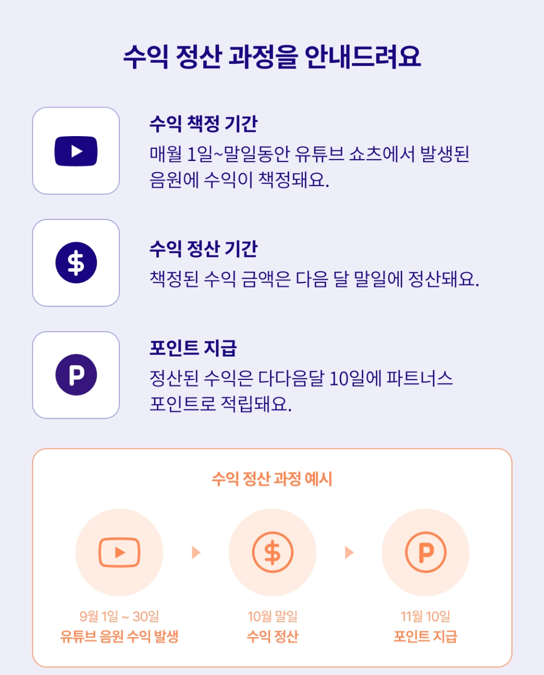 - 확정된 정산금액은 월1회 파트너스 포인트로 지급됩니다.