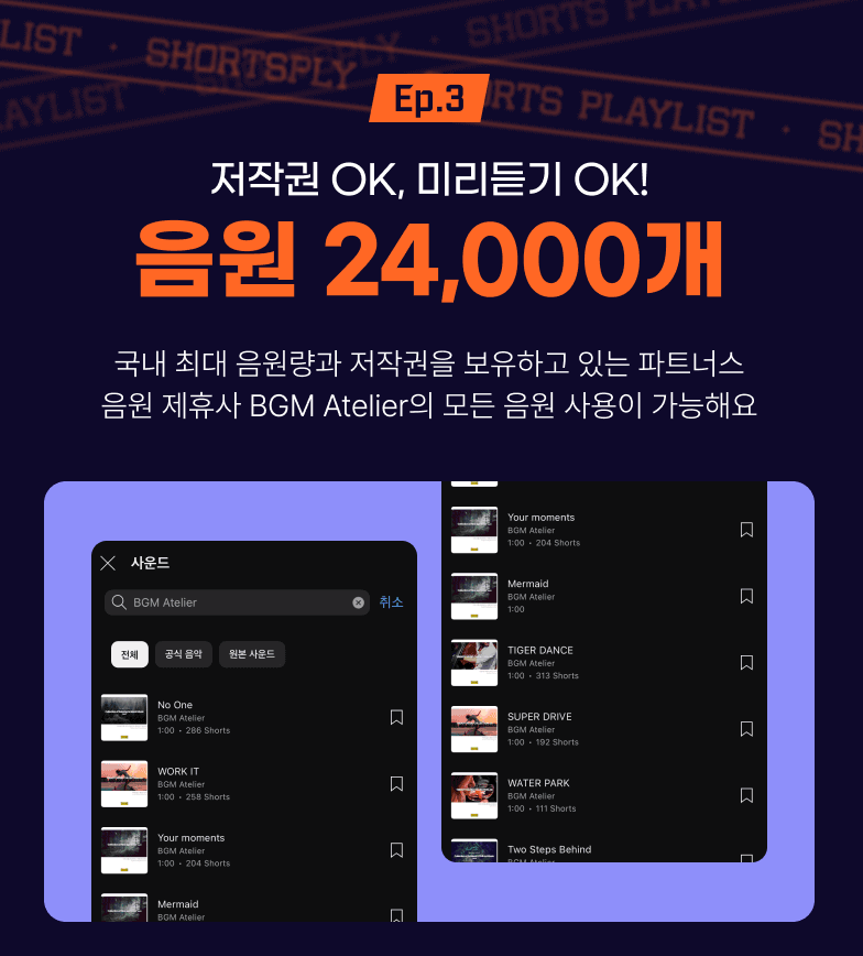 - 24,000개 이상 국내 최대 유튜브 쇼츠 음원을 저작권 문제없이 이용하실 수 있습니다.