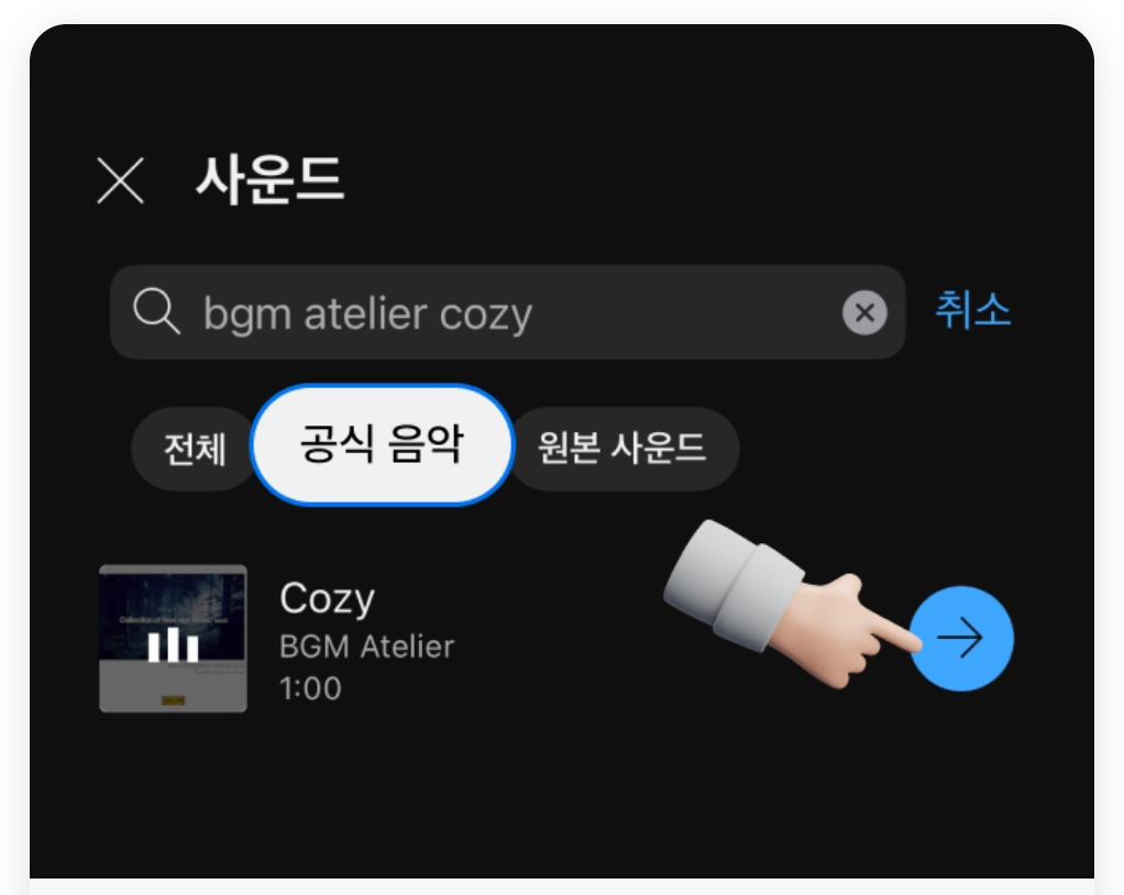 6. 검색 결과에서 공식음악 탭을 클릭 , 검색 내용과 일치하는 음원을 선택해 등록해 주세요.