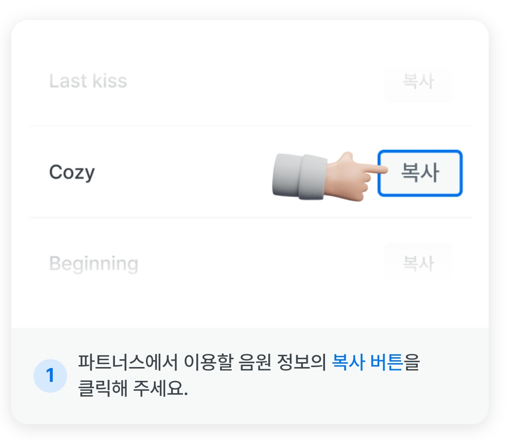 1. 파트너스에서 이용할 음원 정보의 복사버튼을 클릭해 주세요.