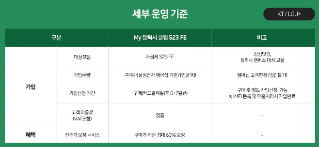 My갤럭시클럽 가입기간에 삼성닷컴을 통해 자급제 S23 FE 시리즈를 구매한 경우에 가입이 가능합니다. (단, 해외폰, 중고단말, 임대폰 등은 제외)