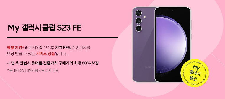 My갤럭시클럽 S23 FE는 할부기간과 관계없이 1년마다 최신 스마트폰 구매와 서비스(잔존가 보장 서비스)를 받을 수 있는 구독 프로그램입니다. (자급제 대상)