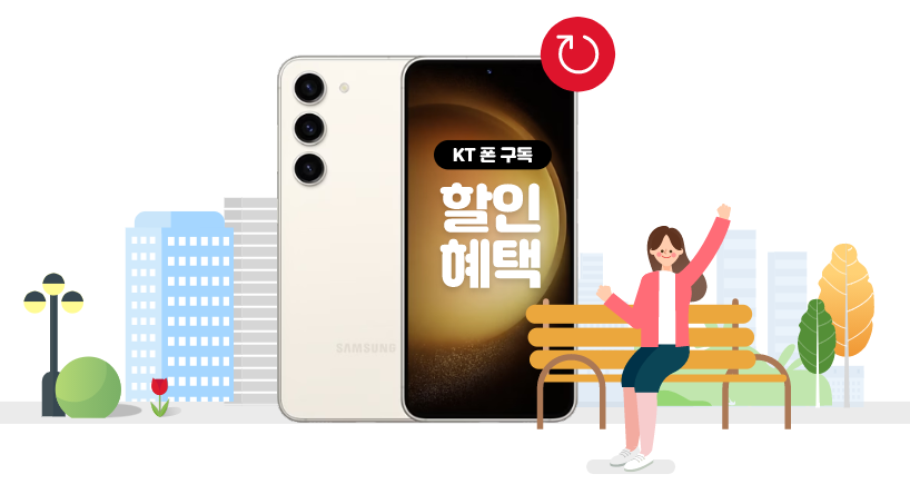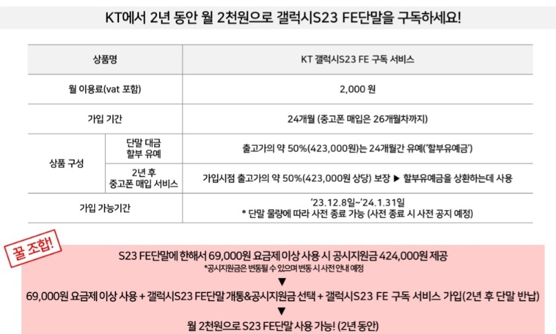 “KT 갤럭시S23 FE 구독 서비스(이하 본 서비스)”는 삼성전자와 제휴하여 제공하는 서비스로 구체적인 가입조건과 보상기준은 설명 및 가입신청서를 통해 반드시 확인하시기 바랍니다.