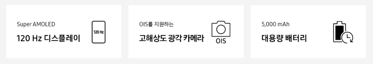 | 디스플레이 | 6.5인치(164mm) FHD+ Super AMOLED U-cut디스플레이, 120Hz |
