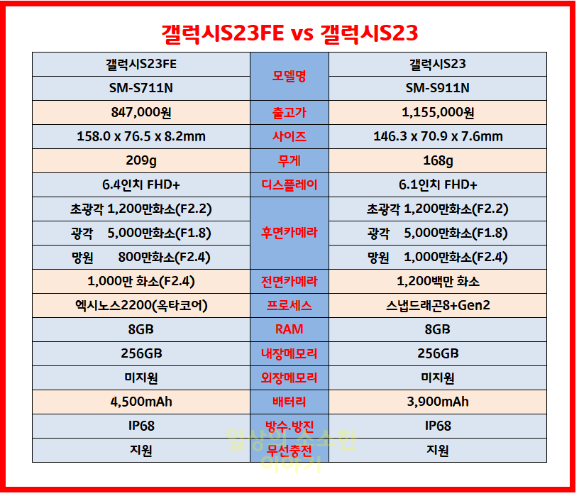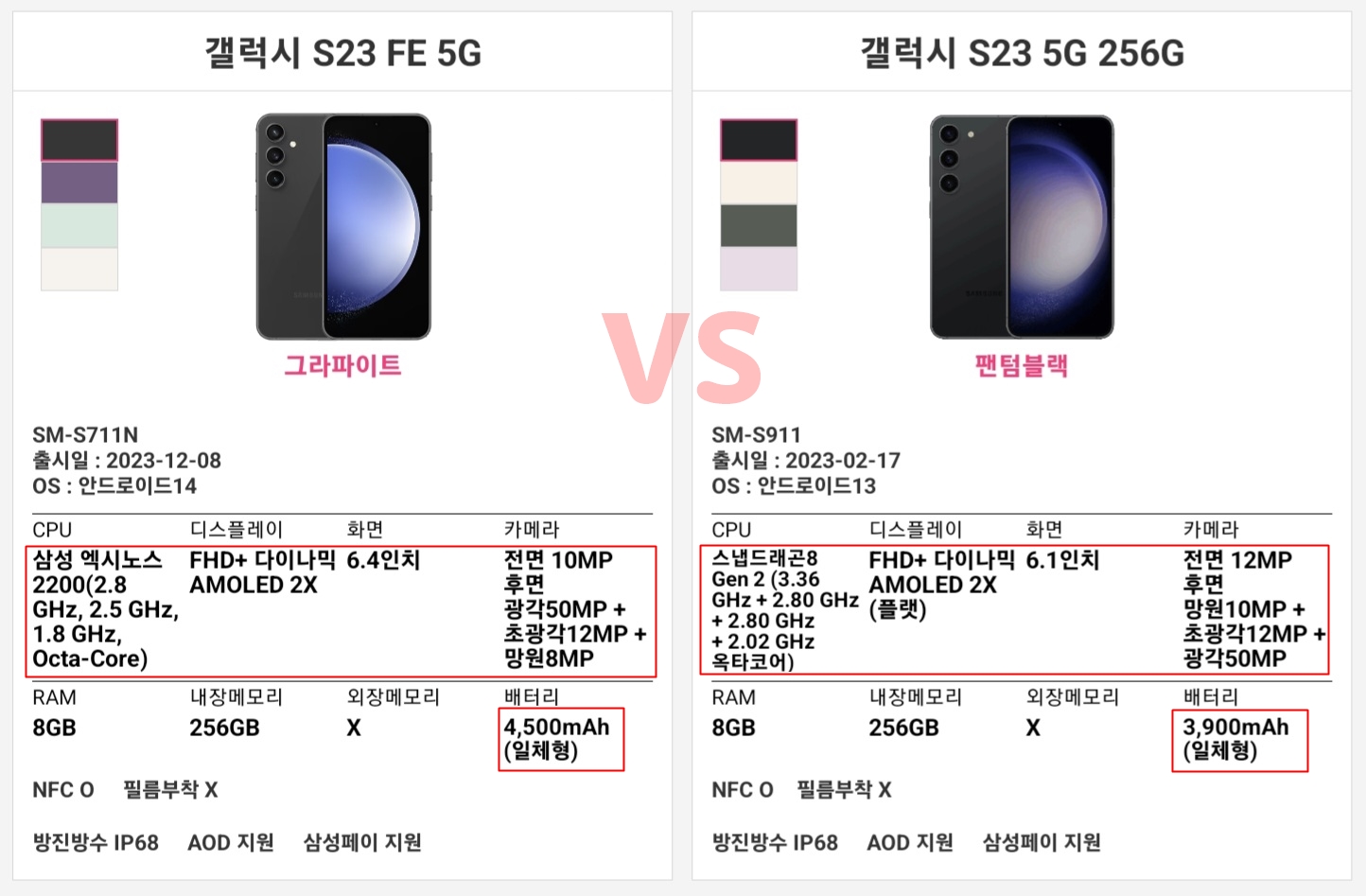 3. 갤럭시 S23FE vs 갤럭시 S23 ( SM-S711N vs SM-S911)